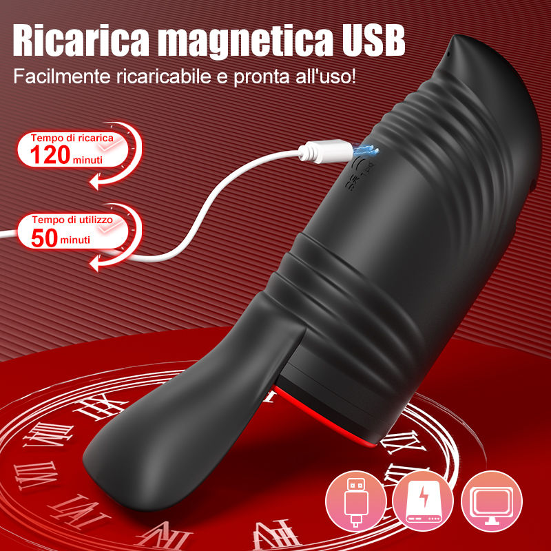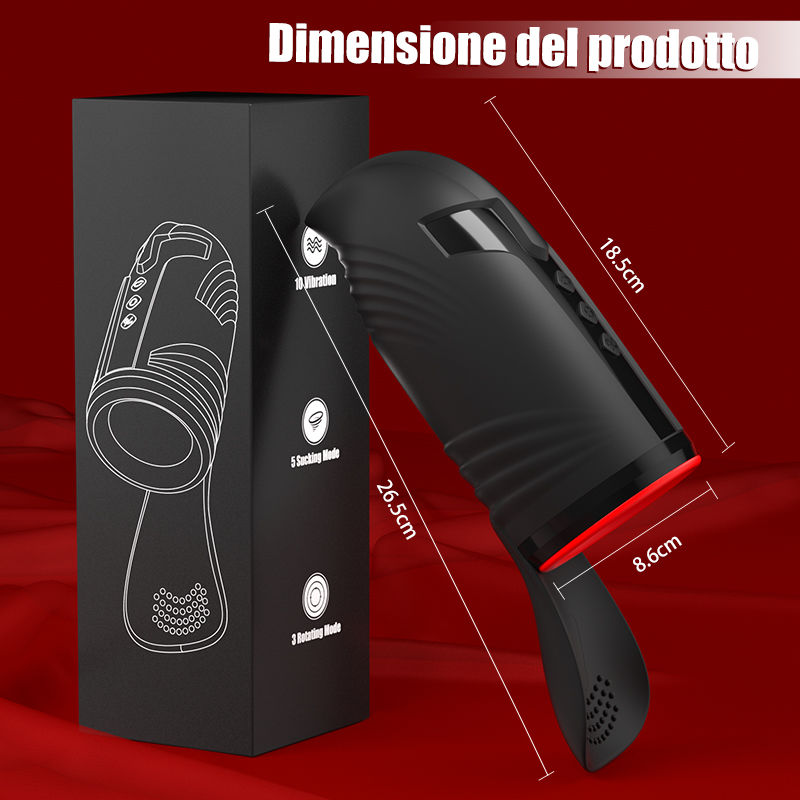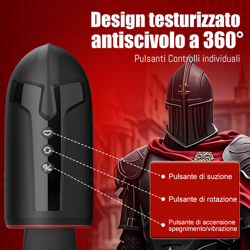 UNICO APPARATO CAVALLERESCO: design esterno suggestivo e bellissimo, conquista come un guerriero medievale! MASTURATORE A TRIPLA FUNZIONE: rotazione intelligente a 360° (3 velocità) + 10 modalità di vibrazione + 5 modalità di aspirazione, più modalità in qualsiasi combinazione;